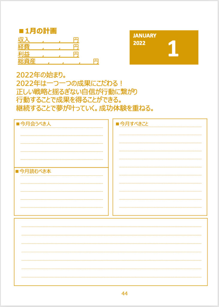 毎月のスタートページには アファメーションや目標を書く欄がついています。
