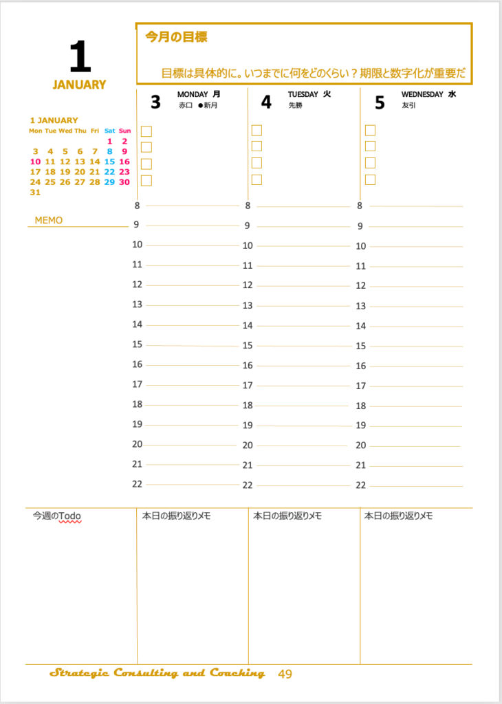 週のページの上部には、その週のモチベーションコールが 書いてあります(笑) そして、日付や曜日だけじゃない!!! 暦も書いてありますよ!!大安、先勝、先負、赤口、仏滅などなど そしてそして、満月や新月、更には、一粒万倍日や天赦日まで!!! ちゃんと調べて記載しましたよ。。 下部には、今週のTODOや、その日の振り返りの欄が用意されています。 そうです。 日々の振り返り、週の振り返り。 そして、翌週の計画が一目瞭然になっているのです。 成功者たちが使っている手帳を、まんま作ってあります!! サイズはA5サイズ、220頁あります。 正直言って、 この手帳に毎月書き込んで、 書き込んだことを行動に移して 振り返りチェックして、アジャストして またトライする!! これを繰り返しているだけで 夢がどんどん叶って行きます!! 当たり前なんですが!!! 手帳なんかなくたって、出来る人は出来ますが カチン手帳は、いい具合にサポートしてくれるのです♪ 目標達成できるようになるのです!! 当たり前ですが!(何度も言う) まぁ、試しに使ってみて下さい。